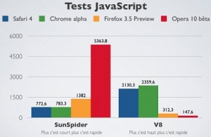 Avec sa version finale, Safari 4 conforte sa place de navigateur le plus rapide en JavaScript sur Mac face à ses principaux concurrents. Il creuse nettement l’écart avec Firefox 3.5 tandis qu’Opera est au fond du trou.
